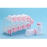 A unique breastmilk storage system designed for freezing or refrigerating breast milk, providing a safe alternative to plastic bags for storing and freezing milk for your baby. The storage rack is designed to allow ten five ounce bottles to rotate so that the milk is used in a "first-in, first-out" basis. Each bottle includes a cap plug and screw on cap to eliminate leaking. The bottles universal thread size allows the bottles to be screwed directly to most breast pumps to be used as breastpump collection bottles. Bottles may also be used to feed the baby with a universal nipple and collar. Set includes 10 bottles, 10 plugs, 10 caps, freezergrade labels, and storage rack. The storage rack is made from heavy duty wire and powder coated in white. Powder coating is a highly durable painting process. The bottles are manufactured using polypropylene plastic. This material meets the Food and Drug Administration requirements of 21CFR 177.1520, conforms to USP XXIII Class VI requirements, and is Kosher certified.